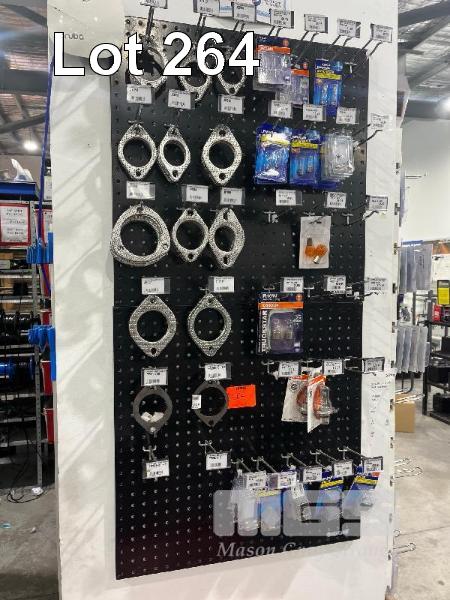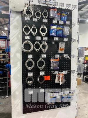 4 x WALL MOUNT SHADOW BOARDS, 450 x 890mm & 600 x 600mm WITH CONTENTS, EXHAUST GASKETS, VARIOUS AUTOMOTIVE BULBS, ETC.
