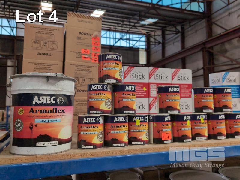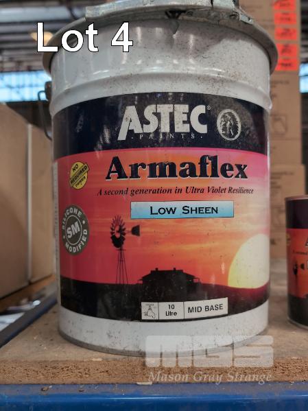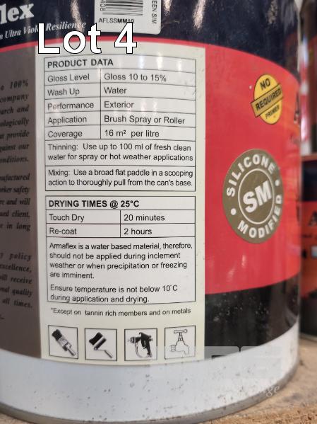 ARAMAFLEX LOW SHEEN ACRYLIC UV RESISTANT PAINTS. 1 X 10 LITRE PAIL. COLOUR MID BASE. 6 X 1 LITRE TINS. COLOUR MID BASE. 3 X 1 LITRE TINS. COLOUR WHITE. 5 X 1 LITRE TINS. COLOUR ACCENT.