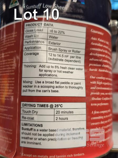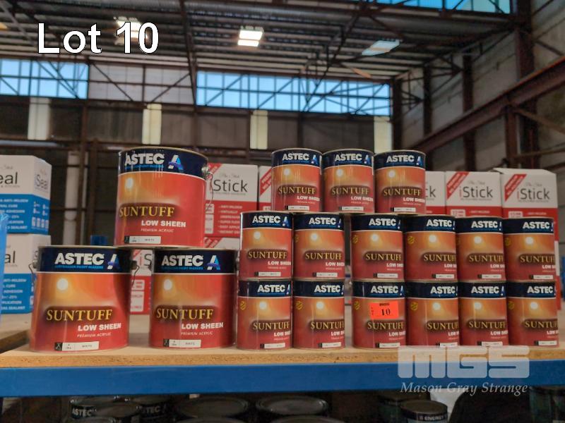 3 X 4 LITRE PAILS AND 15 X 1 LITRE TINS ASTEC PAINTS SUNTUFF LOW SHEEN PREMIUM ACRYLIC PAINT. COLOUR WHITE . 27 LITRES TOTAL.