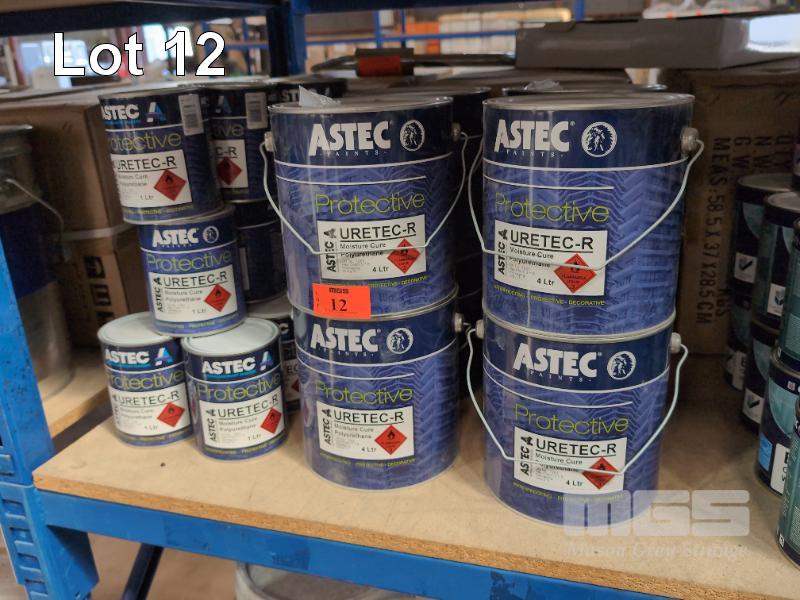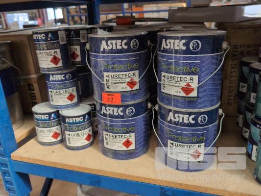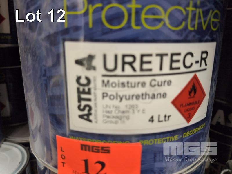 8 X 4 LITRE TINS AND 14 X 1 LITRE TINS ASTEC PAINTS URETEC-R MOISTURE CURE POLYURETHANE SEALANT. 46 LITRES TOTAL.