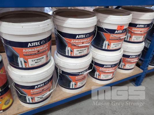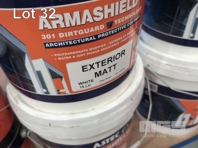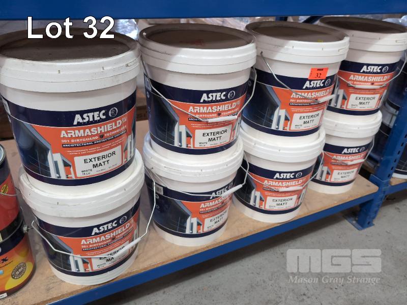 8 X 15 LITRE PAILS ASTEC PAINTS ARMASHIELD EXTERIOR MATT ARCHITECTURAL PROTECTIVE COATING. COLOUR WHITE.