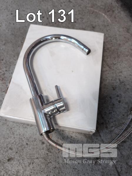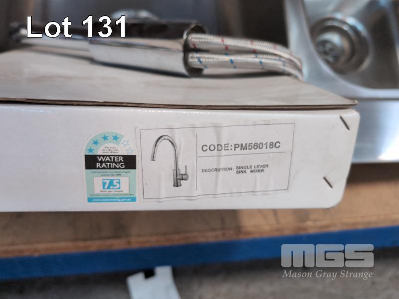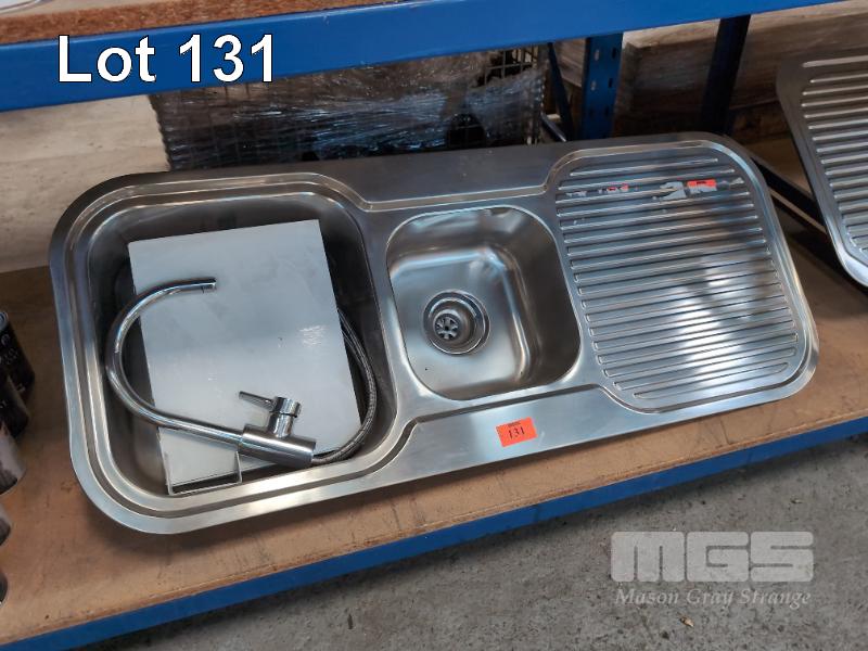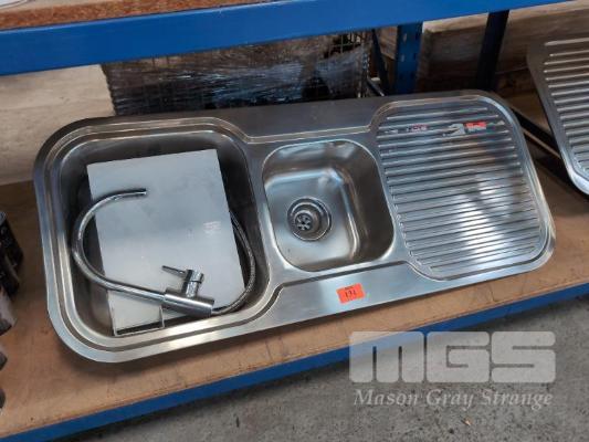 1 X DOUBLE BASIN STAINLESS STEEL SINK AND CHROME SINGLE LEVER SINK MIXER TAP, CURVED SPOUT. AS NEW.