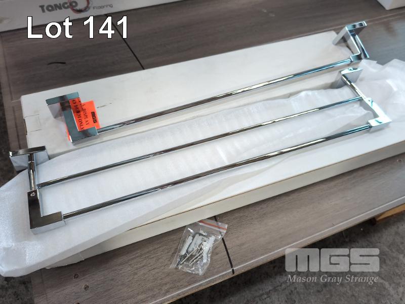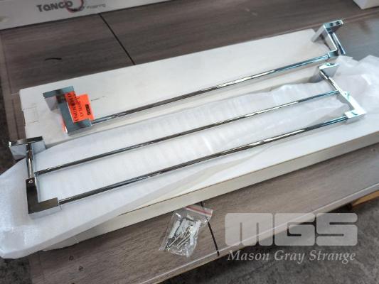 10 X WALL MOUNT DOUBLE TOWEL RAILS, CHROME, WITH FITTINGS. 10 X WALL MOUNT SINGLE TOWEL RAILS, CHROME, WITH FITTINGS. NEW. 2 X CARTONS