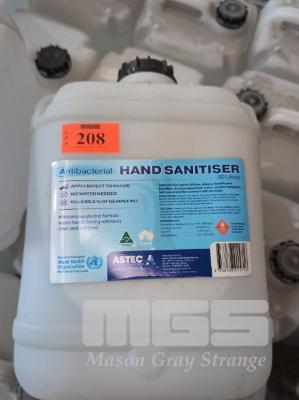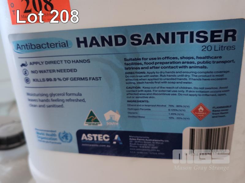 20 X 20 LITRE CUBE DRUMS OF ASTEC ANTIBACTERIAL HAND SANITISER. 75 TO 80% ETHANOL AND ISOPROPYL ALCOHOL WITH HYDROGEN PEROXIDE AND GLYCERINE. ** MOST ARE UNLABELLED **