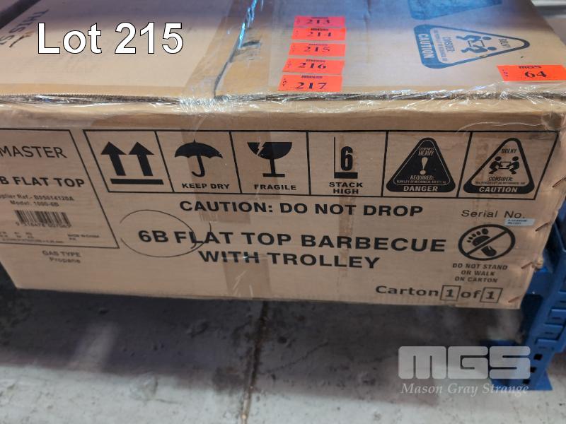GRILLMASTER MOBILE FLAT TOP GAS BBQ 6-BURNER WITH TROLLEY. MODEL 1000-6B. NEW IN BOX. ORP $699