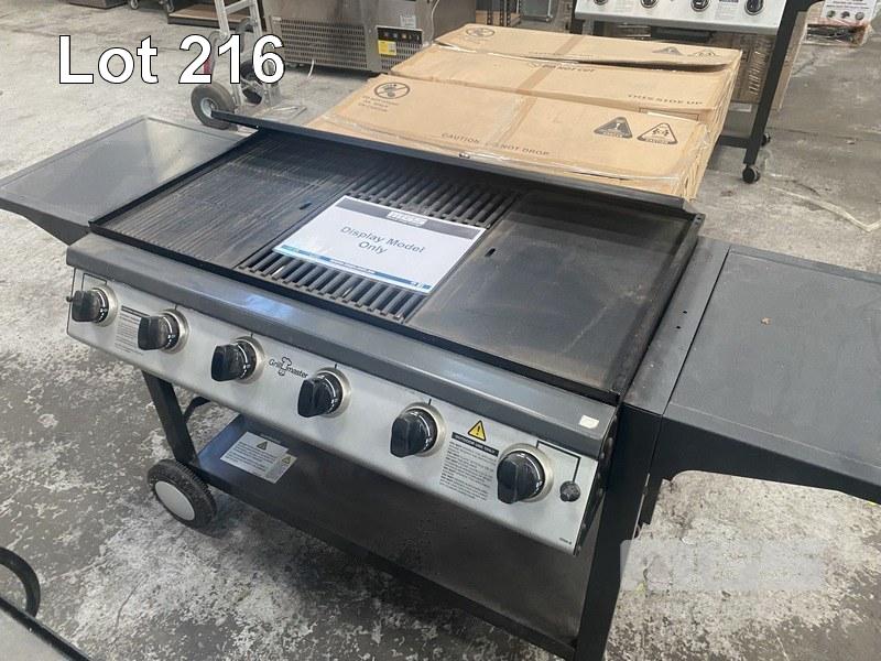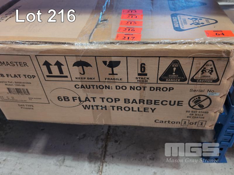 GRILLMASTER MOBILE FLAT TOP GAS BBQ 6-BURNER WITH TROLLEY. MODEL 1000-6B. NEW IN BOX. ORP $699