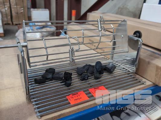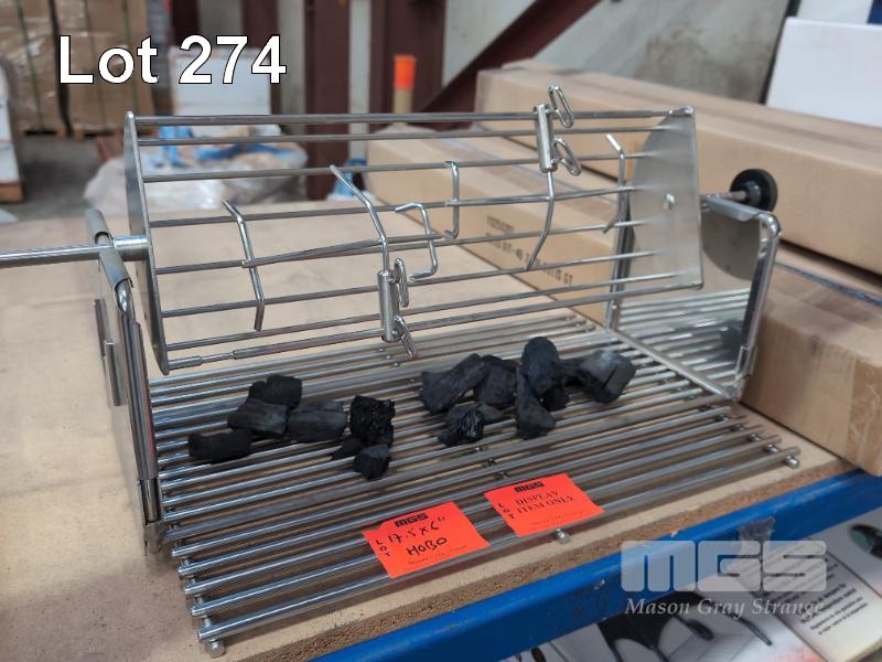 "HOBO" CHARCOAL ROTISSERIE KIT INCLUDES EZQ 17.5 X 6" STAINLESS STEEL ROTISSERIE CRADLE, HANDLE, CLAW CLAMPS & CLAWS AND MOTOR MOUNT. ROTISSERIE STAND. 2 X 304 STAINLESS STEEL COOKING GRIDS ORP $199.00