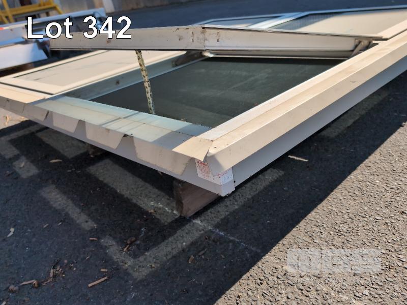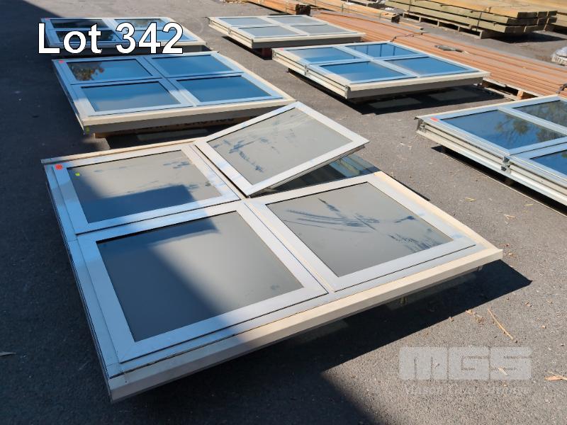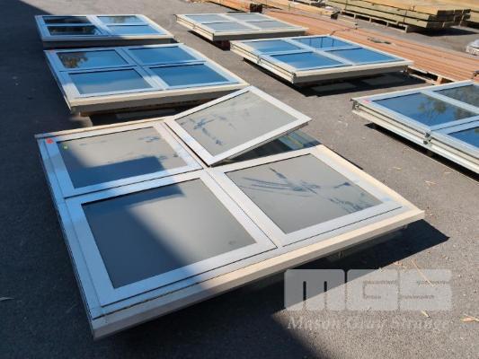 1 X PANEL LARGE 4-AWNING WINDOW ALUMINIUM WINDOW FRAME. OVERALL 1,510 X 1,508 X 105 MM (W H D). FLY SCREENS, TINTED GLASS AND LOCKABLE WINDERS ON EACH. NO KEYS.