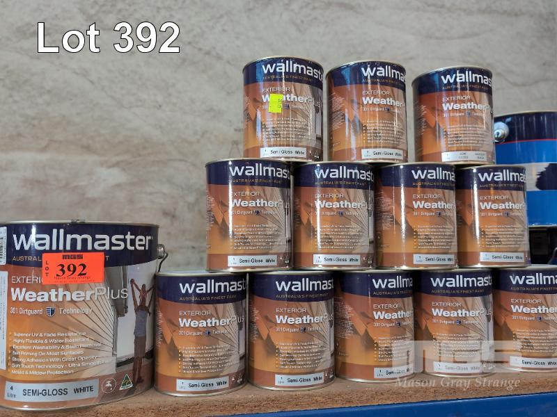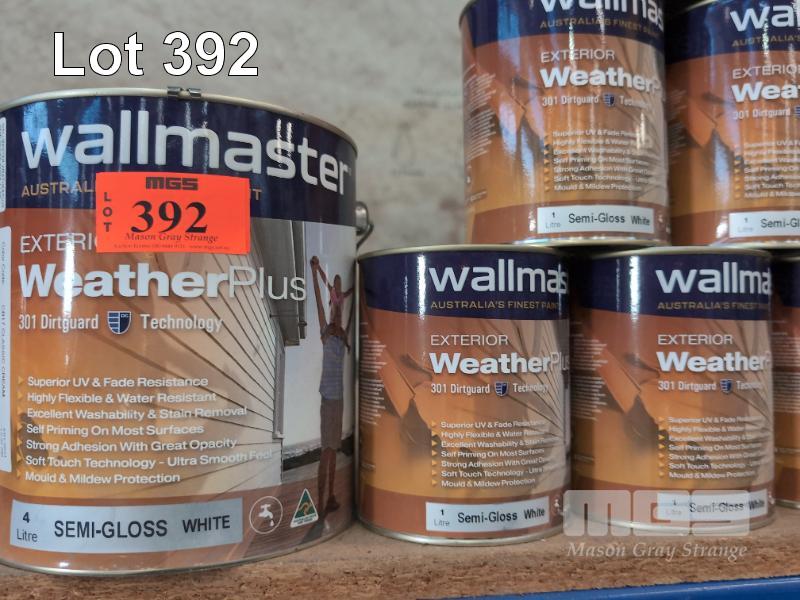 1 X 4 LITRE PAIL ASTEC WALLMASTER WEATHER PLUS EXTERIOR SEMI-GLOSS PAINT. COLOUR WHITE. 12 X 1 LITRE TINS ASTEC WALLMASTER WEATHER PLUS EXTERIOR SEMI-GLOSS PAINT. COLOUR WHITE.
