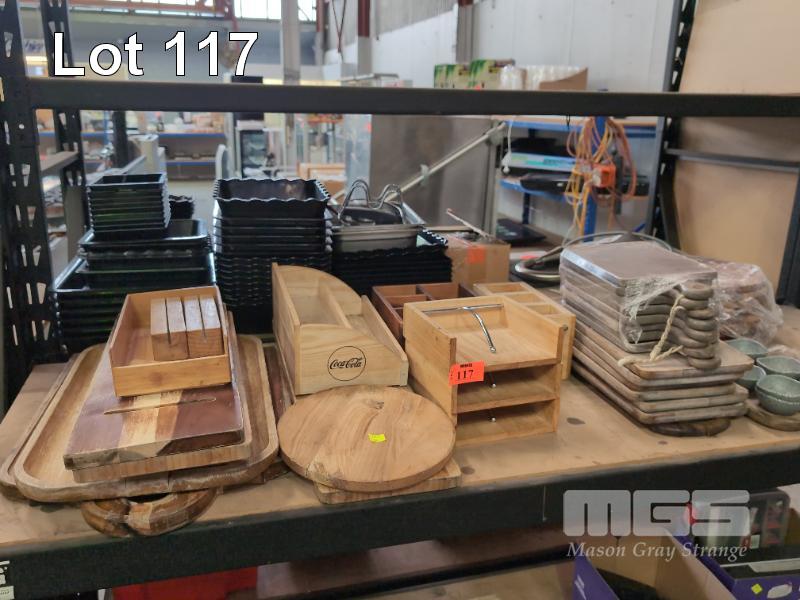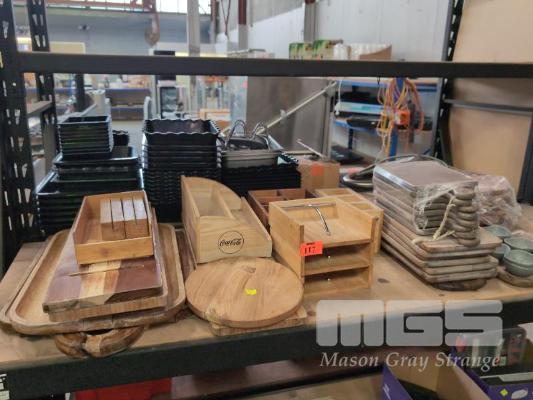 ASSORTED TIMBER SERVING BOARDS & CADDY