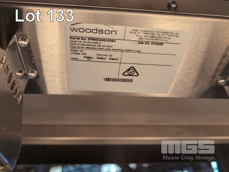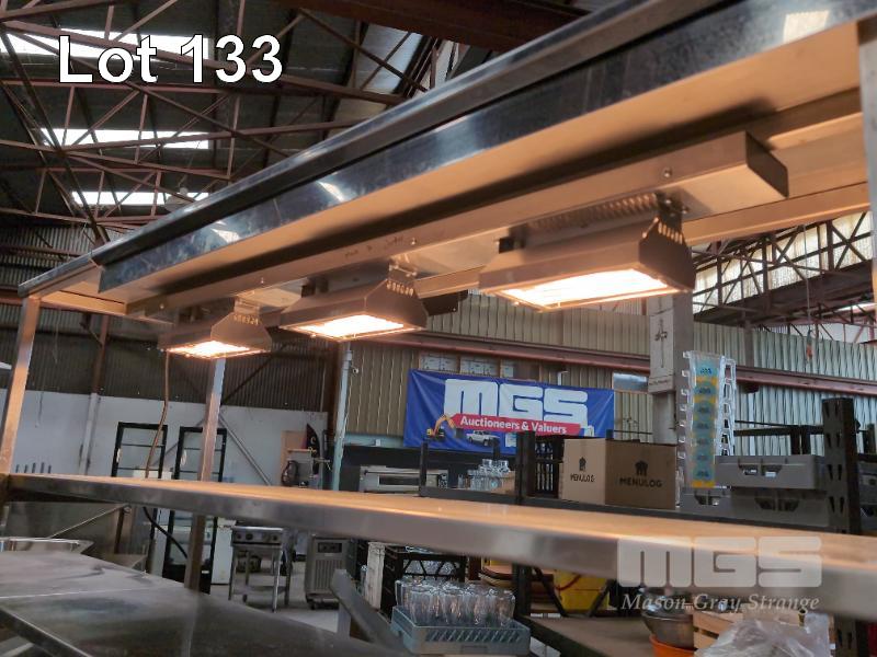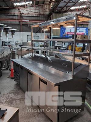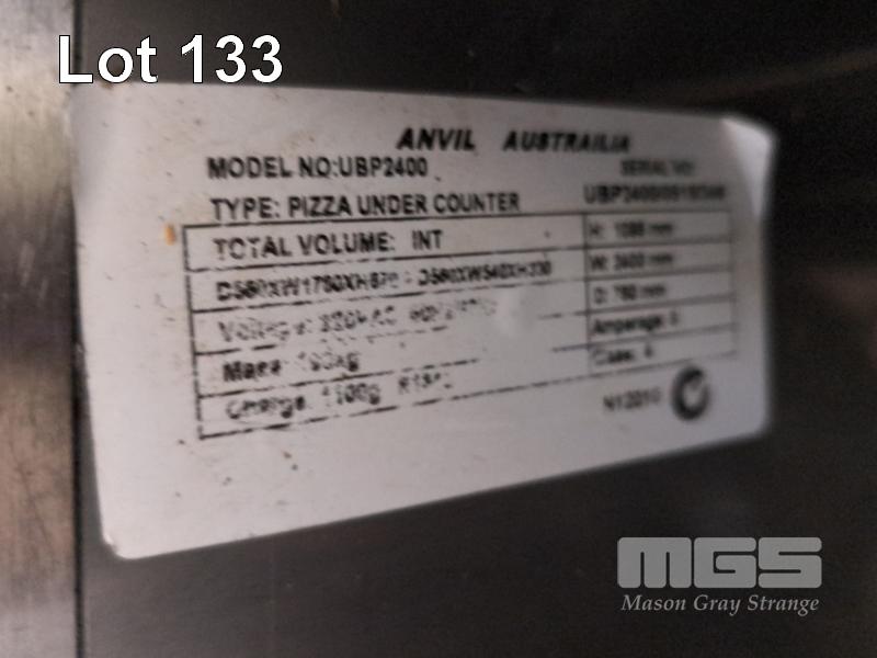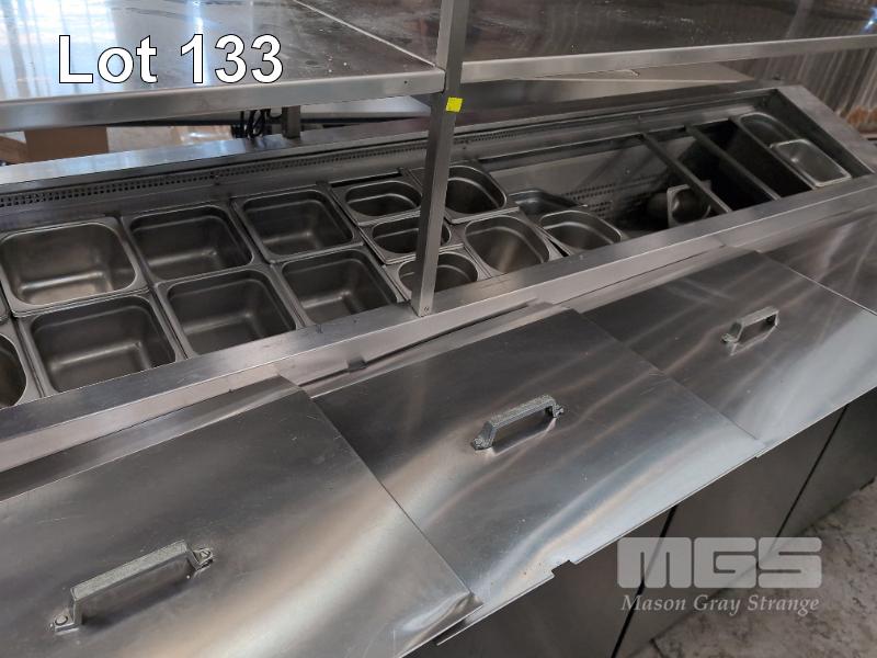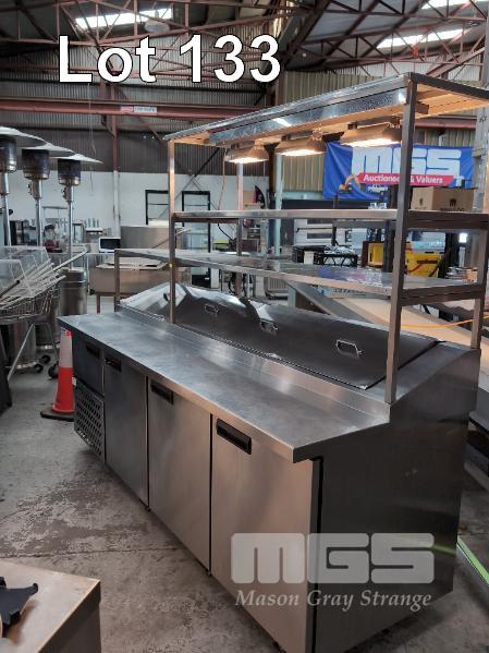 1 X ANVIL AIRE 3.5-DOOR PIZZA BAR UNDER-COUNTER PREP FRIDGE. MODEL UBP2400. ALL STAINLESS STEEL WITH INTRINSIC STAINLESS STEEL 3-TIER SHELF UNIT AND WOODSON 1,200 MM 3-LAMP HEAT LAMP ASSEMBLY.