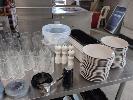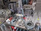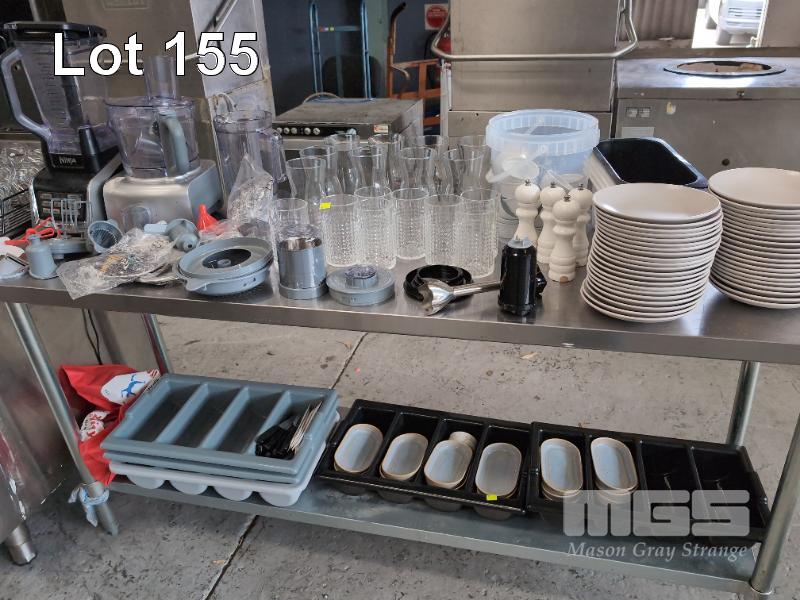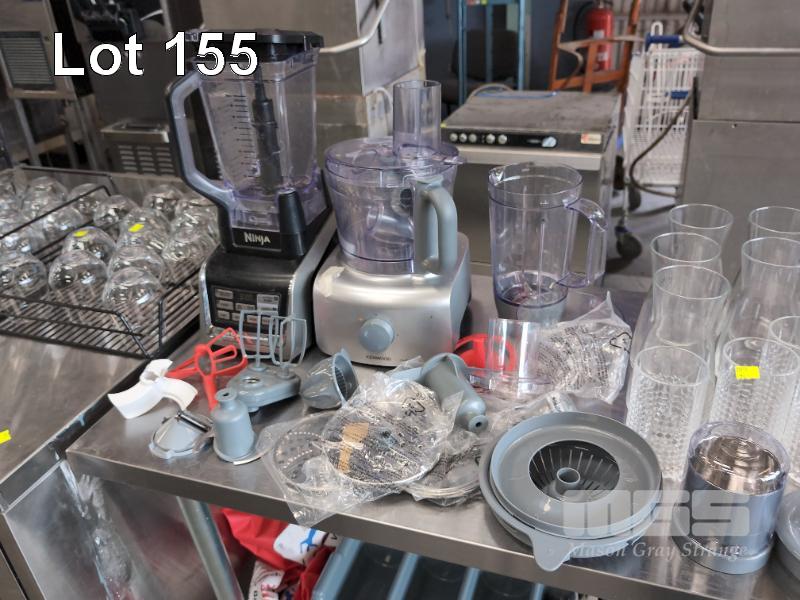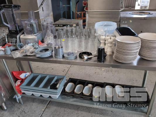 ASSORTED KITCHEN ITEMS AND ELECTRICAL. INCLUDES NINJA AUTO-IQ BLENDER DUO, KENWOOD MULTIPRO FOOD PROCESSOR, GLASSWARE, RAMEKINS, PEPPER GRINDERS, PLATES, UTENSIL HOLDERS ETC. (CONTENTS TABLE TOP AND SHELF)