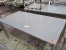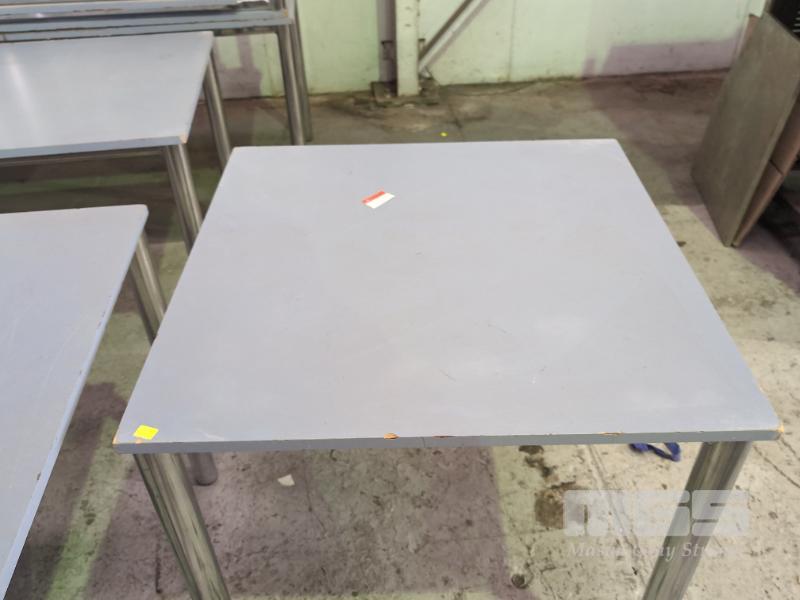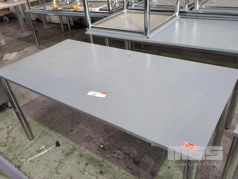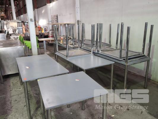 12 X TABLES STEEL FRAME. BLUE LAMINATE TOPS. 8 @ 1,800 740 MM 4 @ 740 X 740 MM