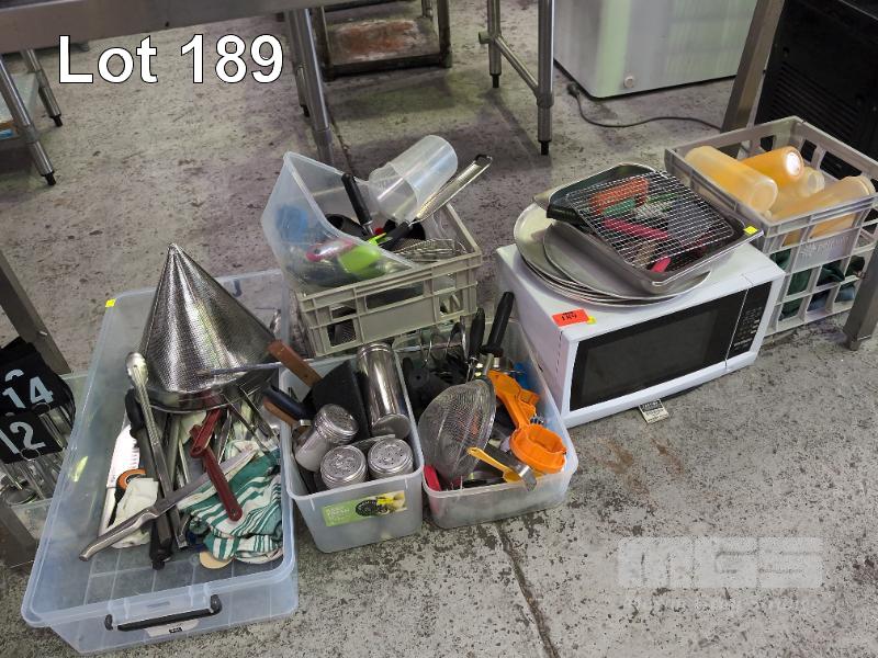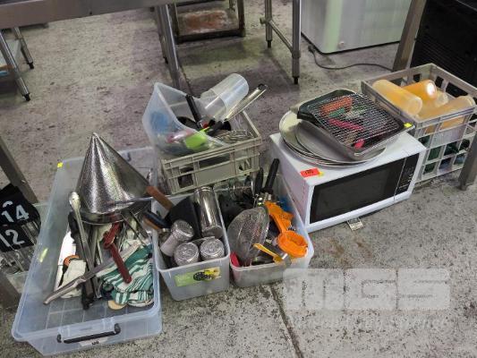 VARIOUS COOKING UTENSILS, KITCHEN SUNDRIES, STAINERS, KNIVES, TONGS, GRATES, ALUMINIUM TRAYS, SAUCE BOTTLES, TABLE NUMBERS, MICROWAVE ETC