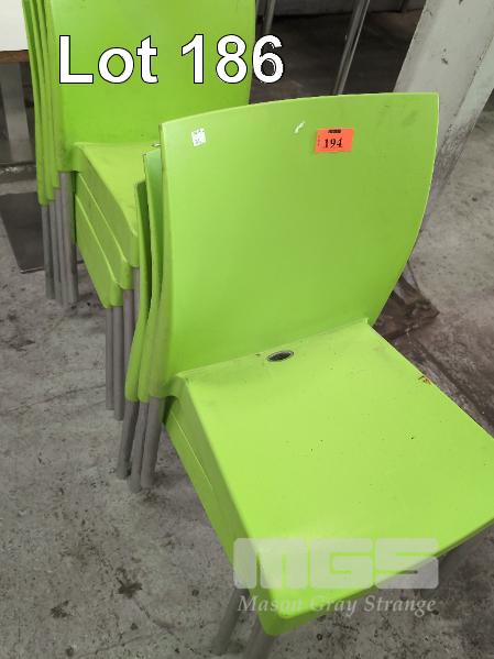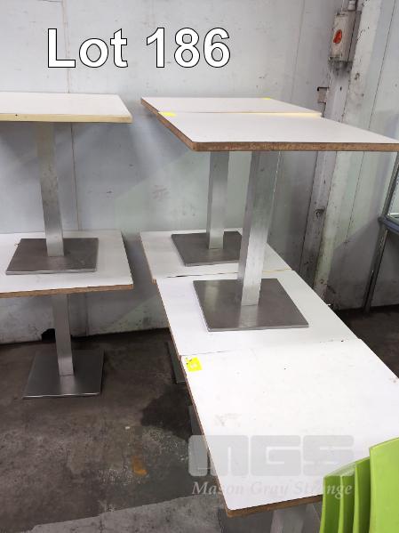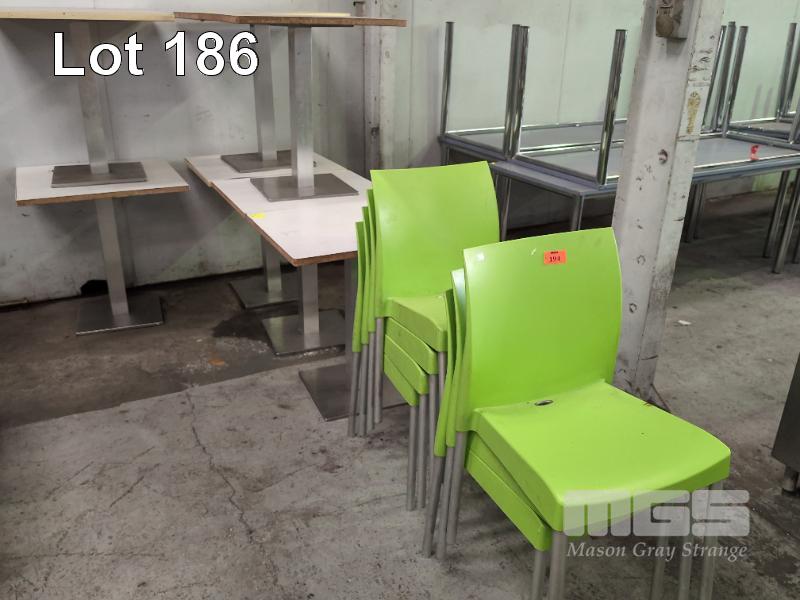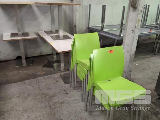 7 x CAFE TABLES, 70 x 60cm, LAMINATE TOP & 7 x LIME GREEN CHAIRS