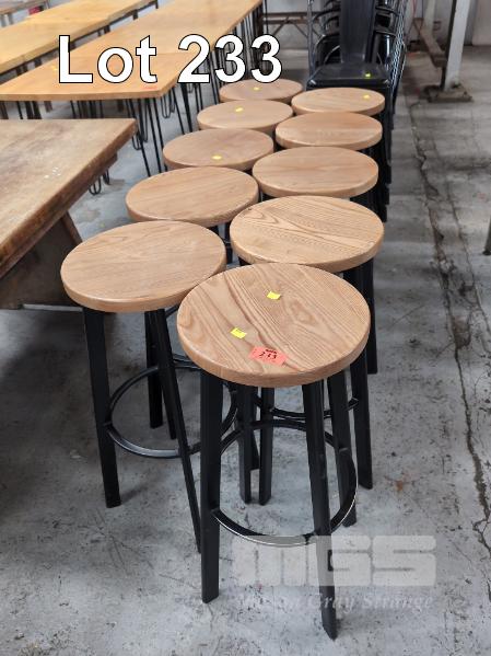 10 X SOLID TIMBER TOP STOOLS, BLACK STEEL FRAME, 750mm (H) MADE BY THE TABLE & CHAIR CO