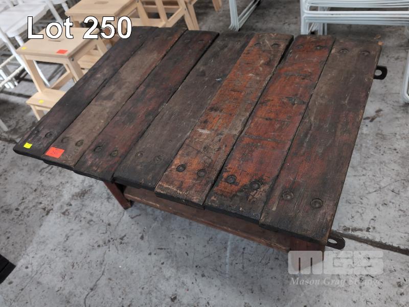 BESPOKE RUSTIC SOLID TIMBER ANTIQUE "CONVEYOR BELT" COFFEE TABLE. 1,010 X 760 MM.