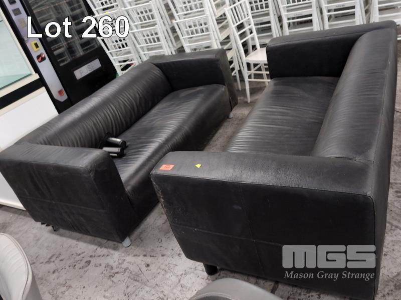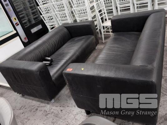 2 X 2-SEATER SOFAS, BLACK VINYL.