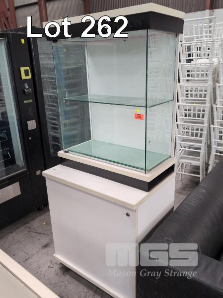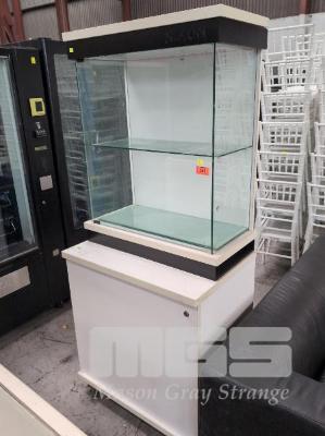 1 X RETAIL GLASS DISPLAY CABINET. 3-GLASS DISPLAY SHELVES, 4-STORGE DRAWS.