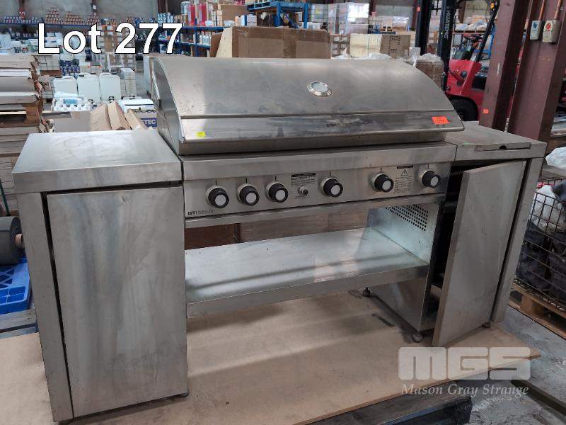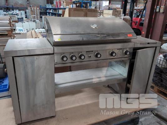 1 X 6-BURNER STAINLESS STEEL HOODED BBQ, GRANDHALL GT15SB-S. WITH BACK BURNER, ELECTRONIC IGNITION AND SIDE CUPBOARDS.