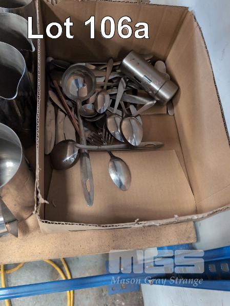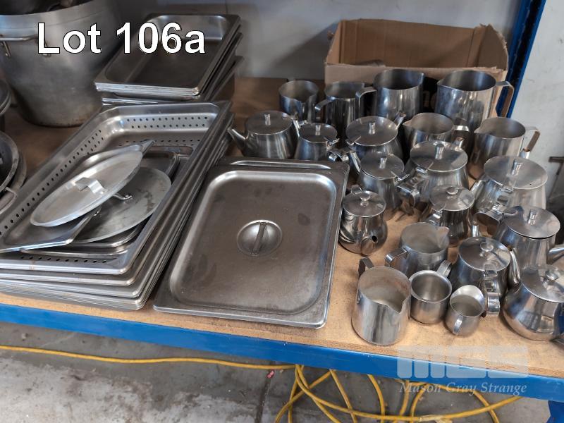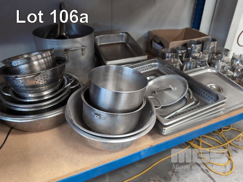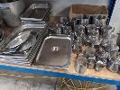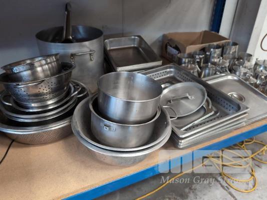 ASSORTED STAINLESS STEEL KITCHENWARE & TABLE SERVICE PIECES.