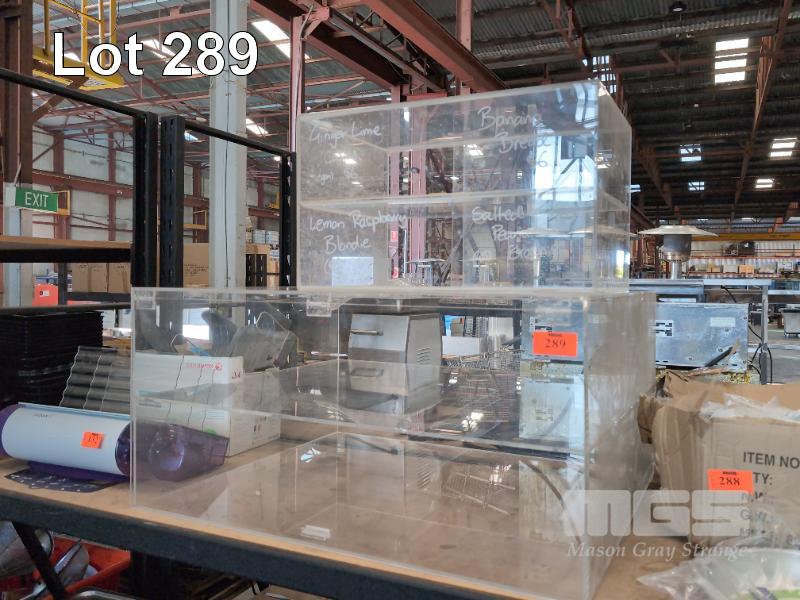 2 X 2-TIER ACRYLIC COUNTERTOP DISPLAY CASES. 1 @ 500 X 330 X 300 MM (W D H) 1 @ 850 X 710 X 420 MM (W D H)