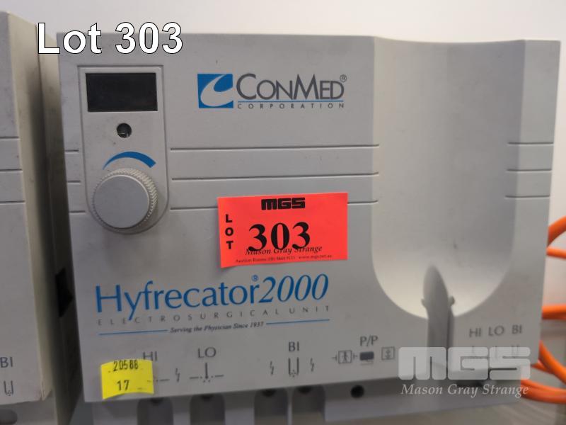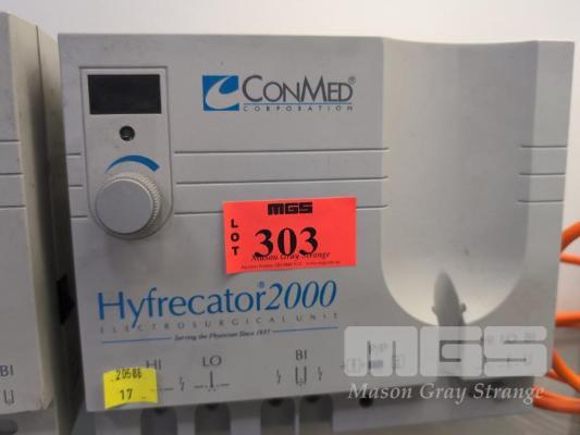 CONMED HYFRECATOR 2000 ELECTROSURGICAL UNIT, MOD: 7-900-230, SERIAL: 12JGJ078, 240V 10AMP PLUG WITH BOOKLET & ACCESSORIES