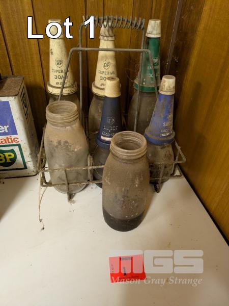 OIL BOTTLE RACK & CONTENTS INC 2 x BP SUPER MS 30/40, 2 x SUPER VISCO STATIC & BP ENERGOL PLASTIC TOPS, 5 x QUART BOTTLES & 2 x PINT BOTTLES
