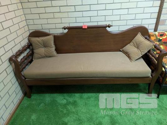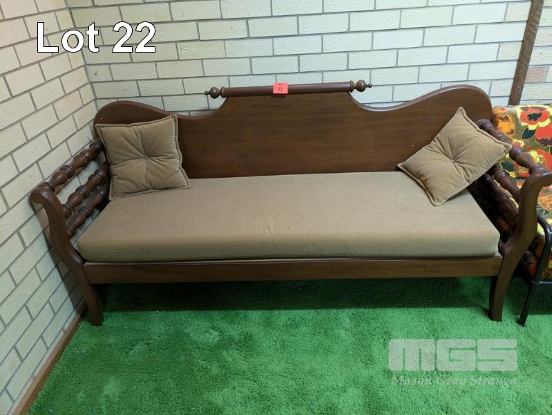 TIMBER FRAME MINERS COUCH WITH BROWN FABRIC UPHOLSTERED CUSHIONS