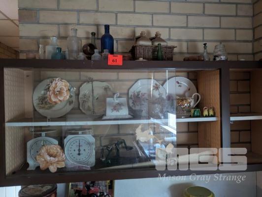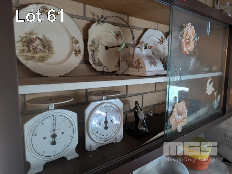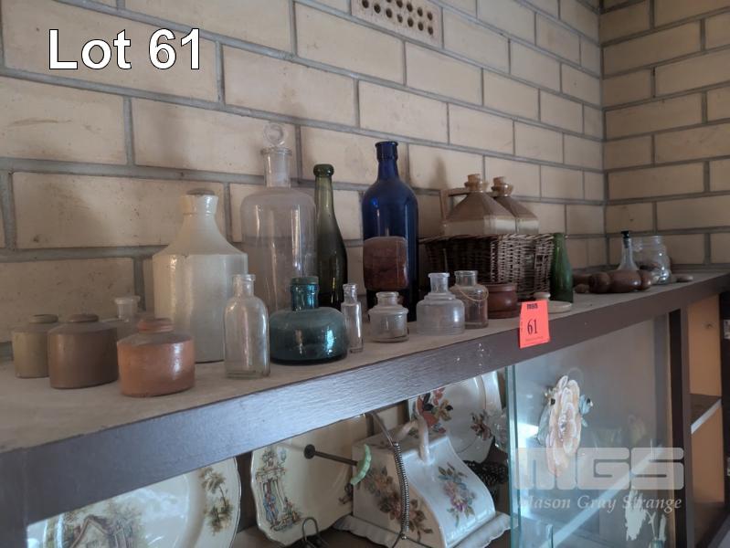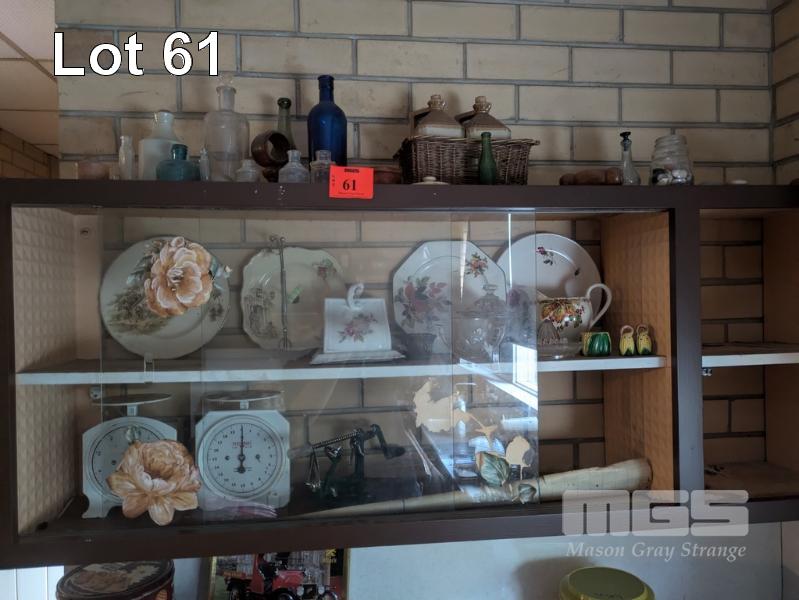 CLOCK FACE SCALES, CERAMIC & GLASSWARE, VINTAGE GLASS & STONEWARE BOTTLES