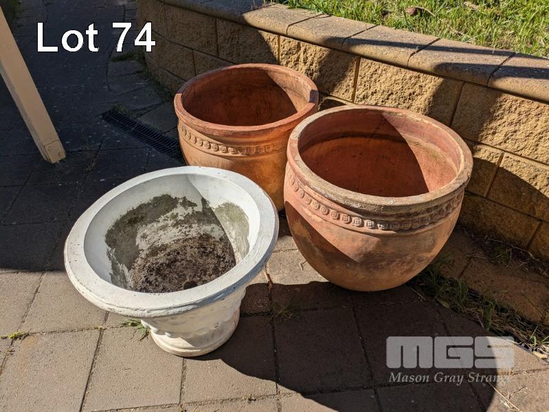 PAIR OF LARGE TERRACOTTA POTS & WHITE PAINTED CONCRETE POT