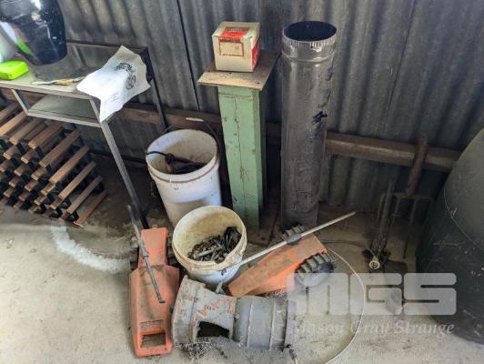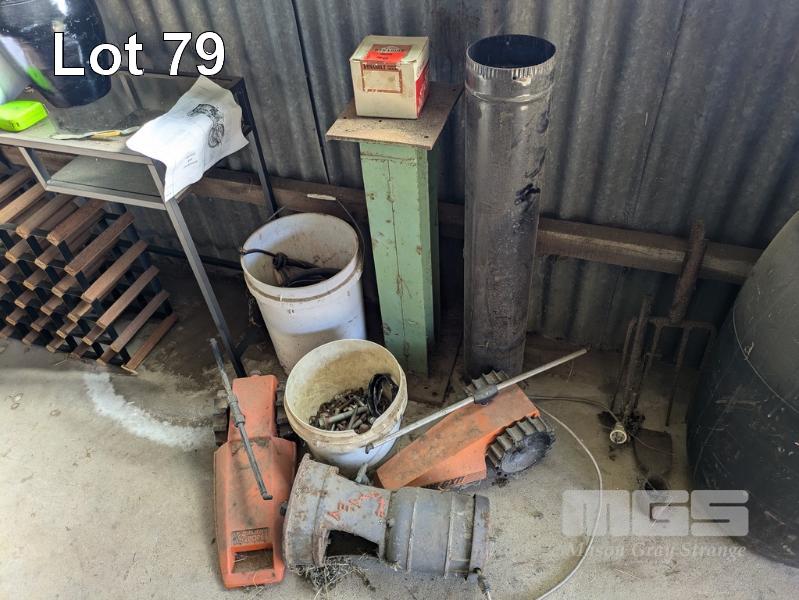 ASSORTED LARGE NUTS & BOLTS, STEEL PEDESTAL, FLUE SECTION, 2 x TRAVELLING SPRINKLERS & VINTAGE DAVEY PUMP