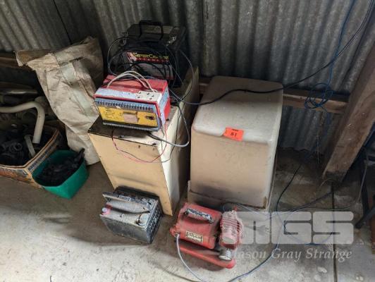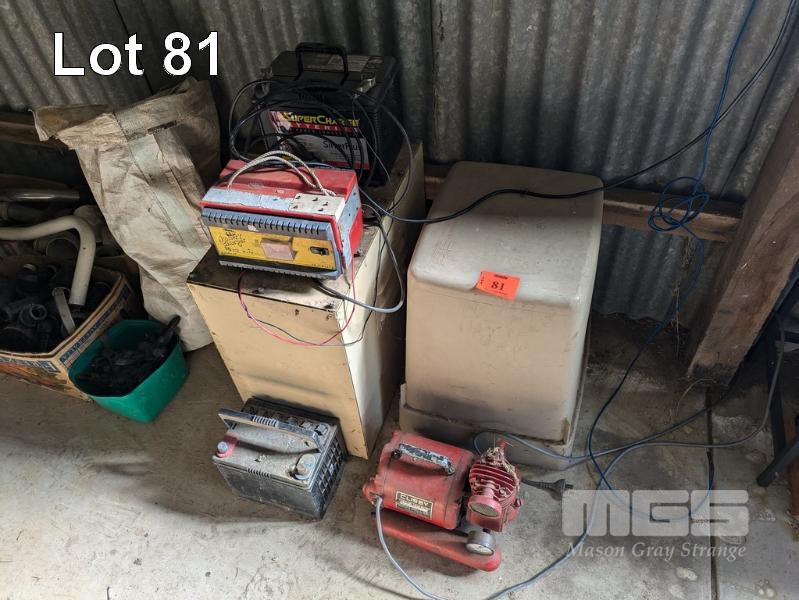 PLASTIC PUMP COVER, STEEL CHARGER CASE, BATTERY CHARGER & CLISBY AIR COMPRESSOR
