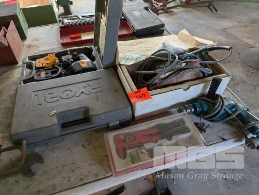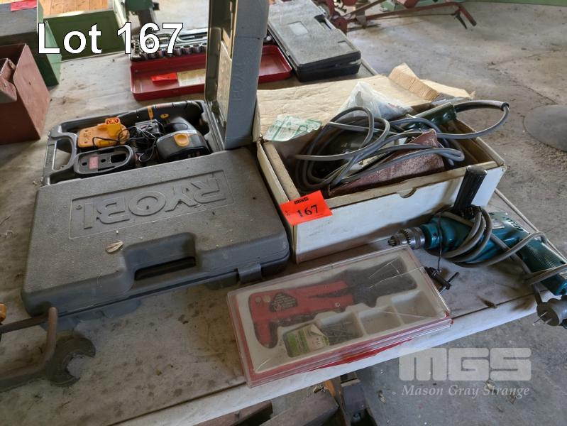 METABO SANDER, MAKITA DRILL, 2 x RYOBI CORDLESS DRILLS & POP RIVET GUN