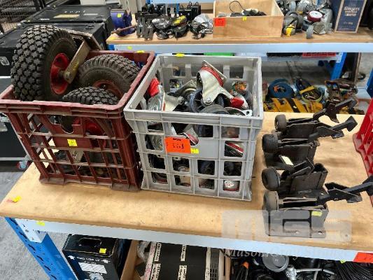 3 x MILK CRATES OF MEDIUM & HEAVY DUTY CASTOR WHEELS, STOP BLOCKS, ETC