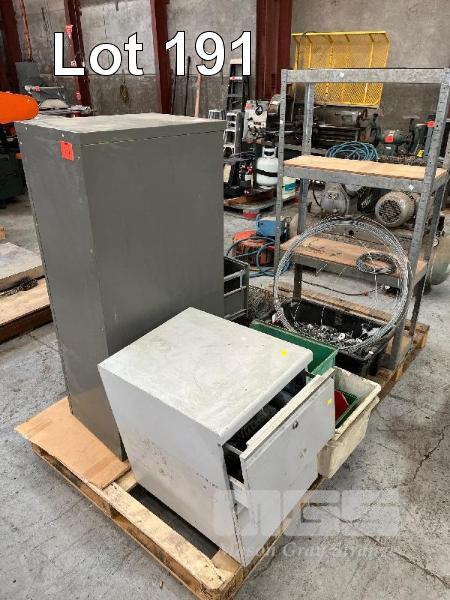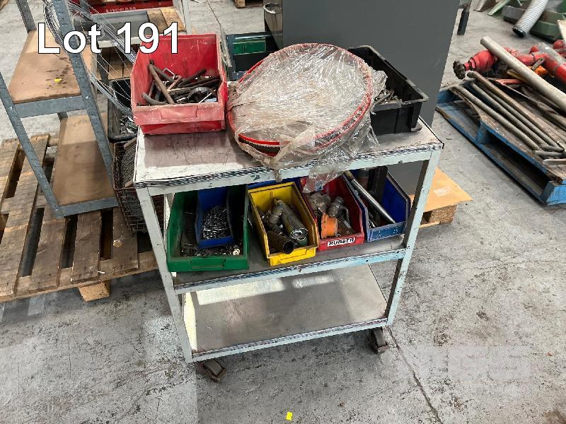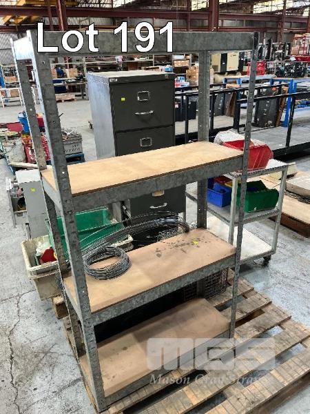 1 x TUB TEK SCREWS, 4 TIER SHELF UNIT, MOBILE TROLLEY, SCREWS, METAL 4 DRAWER FILING CABINET & 2 DRAWER METAL CABINET,