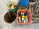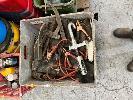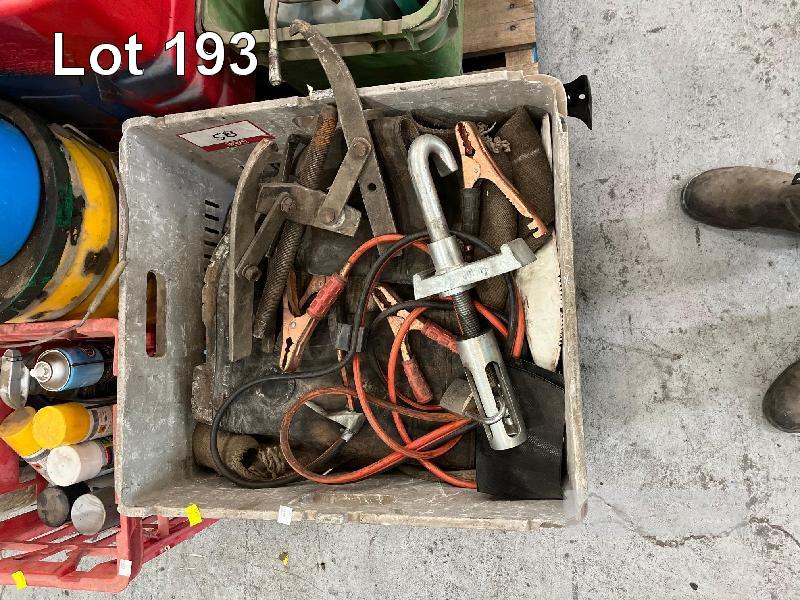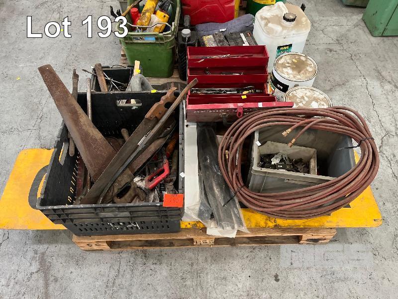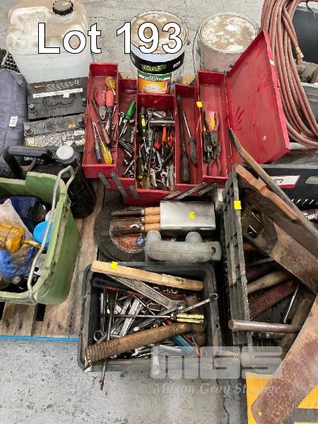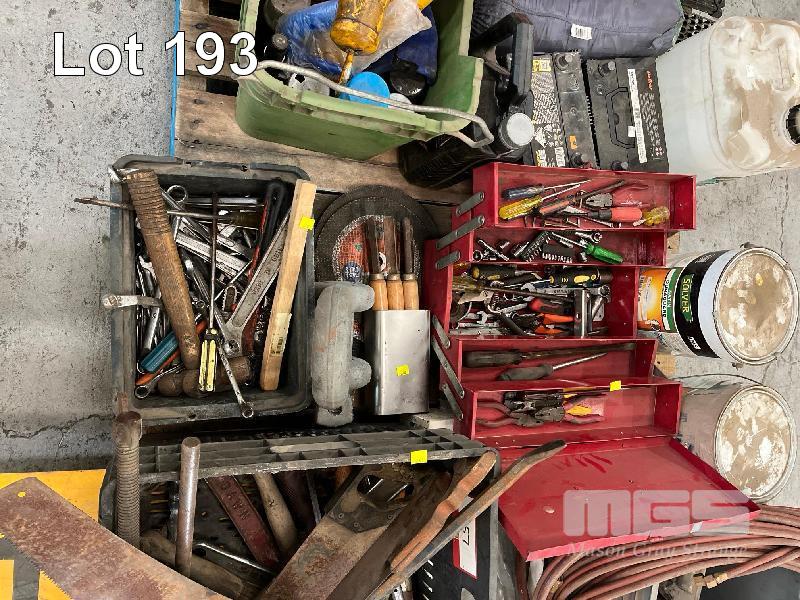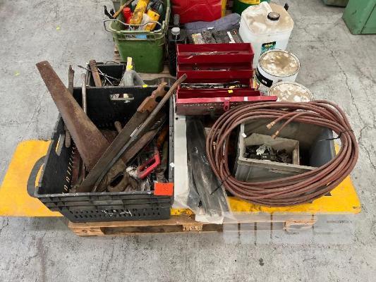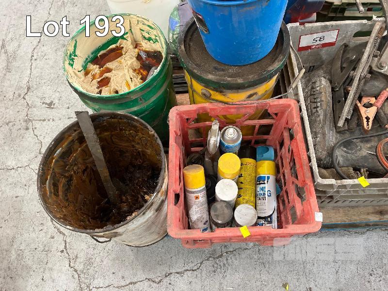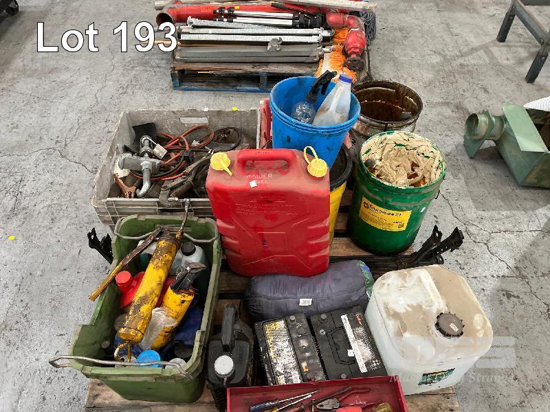 TOOLBOX, 2 x PAINT TINS, HOSES, 2 x CAR BATTERIES, GREASE DRUMS, JERRY CAN, GUM BOOTS, STRAPS, GREASE GUNS, SPRAY CANS, ETC, 2 x PALLETS
