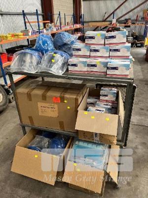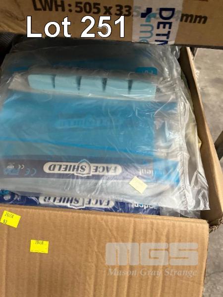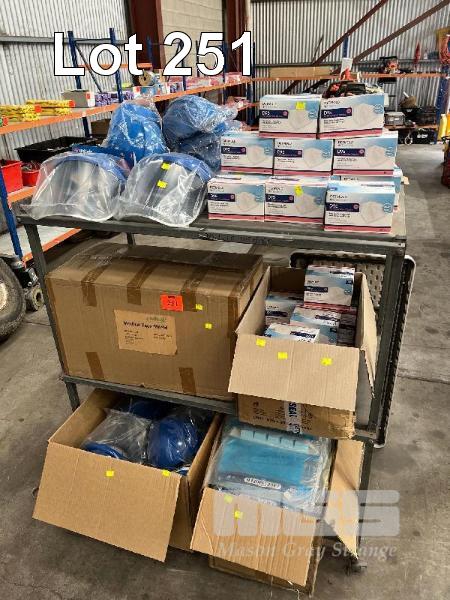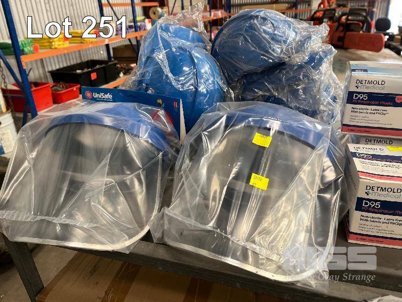 2 x BOXES FACE SHIELDS, 1 x BOX HARD HATS WITH FACE SHIELDS, 10 x BLUE HARD HATS & 6 x BOXES SURGICAL MASKS, 3M