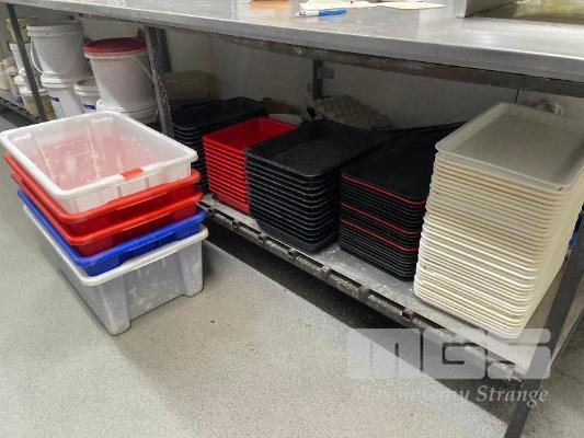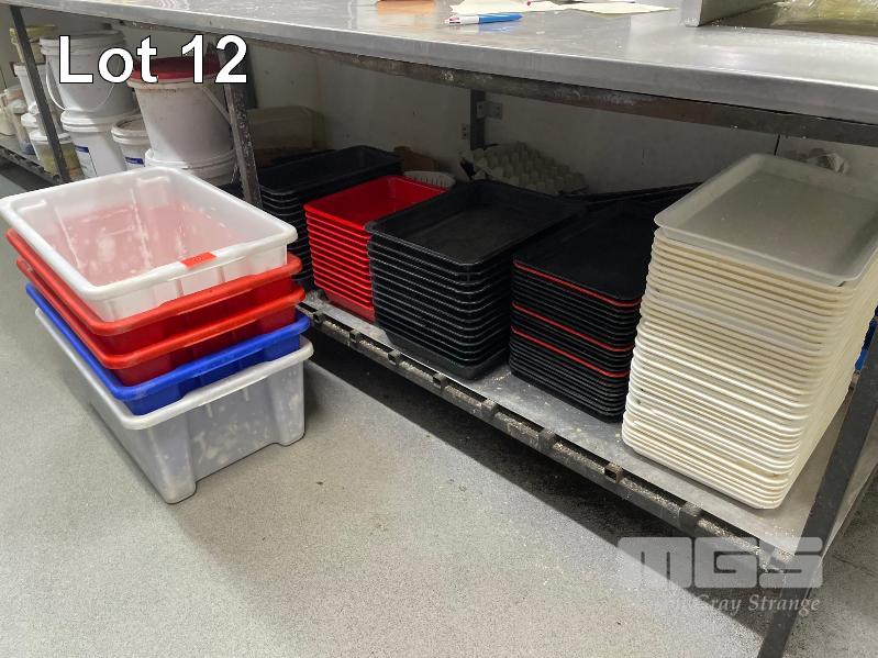 LARGE QTY PLASTIC TUBS, TRAYS & BUCKETS, (CONTENTS UNDER BENCH)