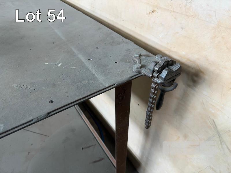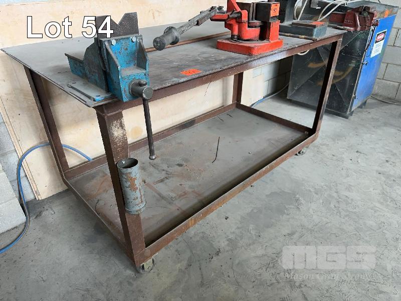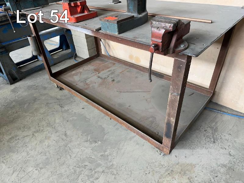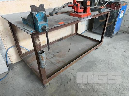 PLATE STEEL WORK BENCH, 1800 x 1050mm, ANGLE STEEL, MOBILE WITH 5 & 4" VICES & CHAIN VICE,