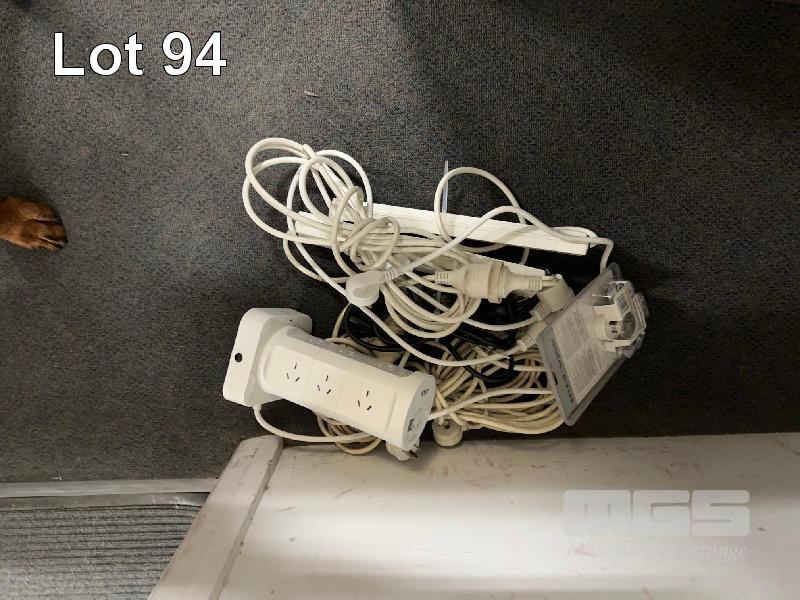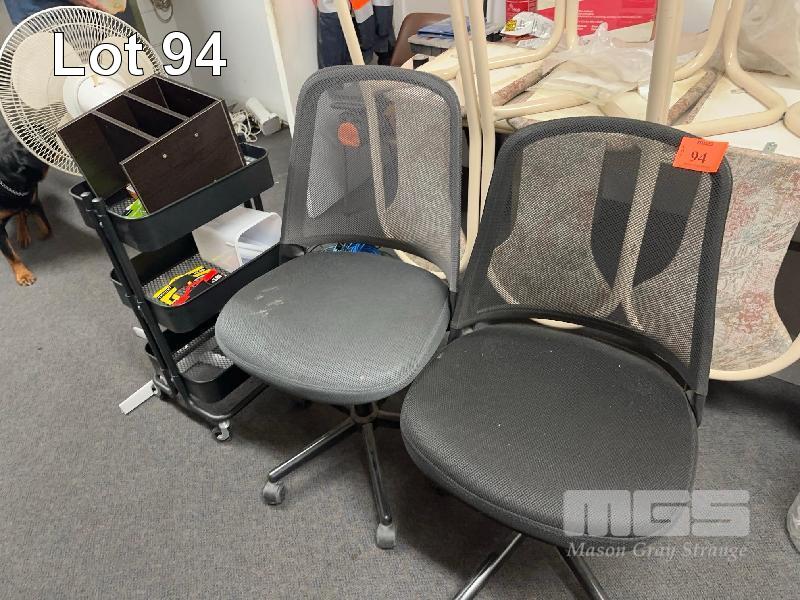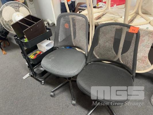 PAIR GAS LIFT OFFICE CHAIRS, MESH BACK, FAN, TROLLEY & POWER CORDS, ETC.