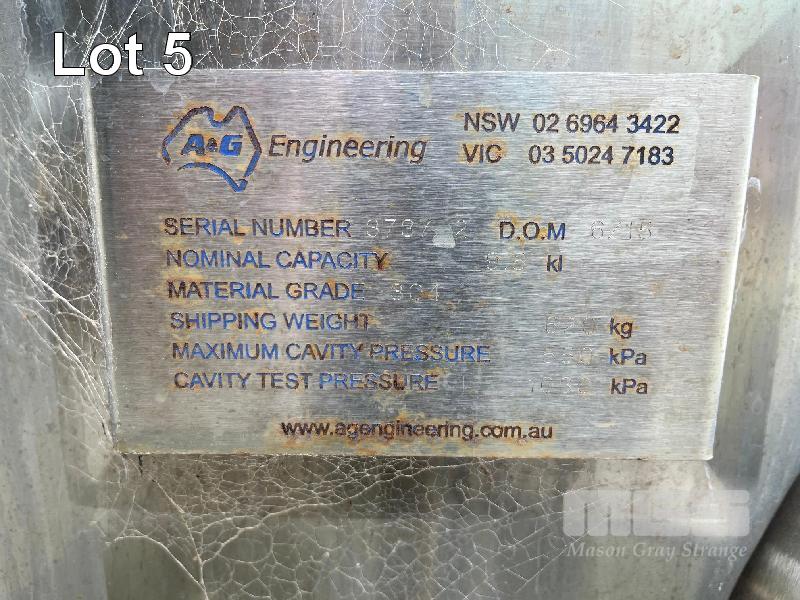 9,500L STAINLESS STEEL UPRIGHT TANK, A&G ENGINEERING, 304 GRADE STAINLESS STEEL, DOM: 2015, FORK POCKETS, TOP & FRONT ACCESS HATCHES COOLING JACKET, TEMP PROBE