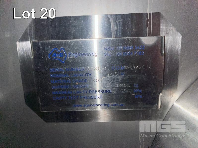 24,500L STAINLESS STEEL UPRIGHT TANK, A&G ENGINEERING, 304 GRADE STAINLESS STEEL, DOM: 2017, FORK POCKETS, TOP & FRONT ACCESS HATCHES COOLING JACKET, TEMP PROBE