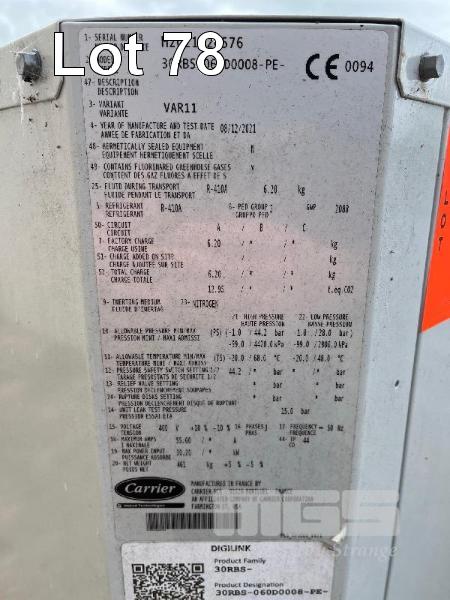 REFRIGERATION UNIT, CARRIER AQUA SNAP MOD:30RBS-060D0008-PE-VARIANT: VAR11 NOMINAL CAPACITY 60KW, DOM 2021 415V