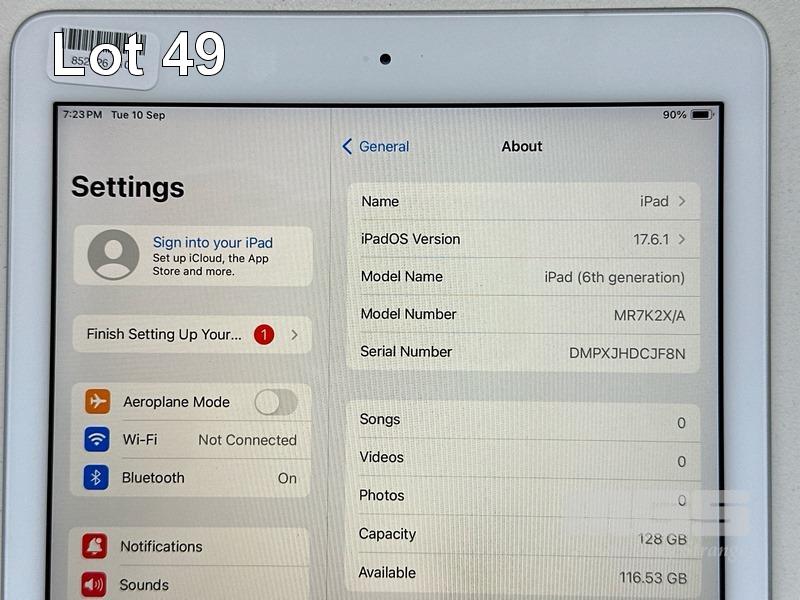 APPLE iPAD 6TH GEN, 128GB, Wi-Fi, SILVER, MODEL MR7K2X/A, A1893 WITH CABLE & CHARGER S/N:DMPXJHDCJF8N