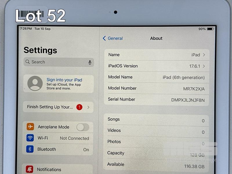 APPLE iPAD 6TH GEN, 128GB, Wi-Fi, SILVER, MODEL MR7K2X/A, A1893 WITH CABLE & CHARGER S/N:DMPXJLJNJF8N