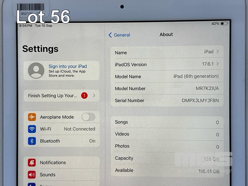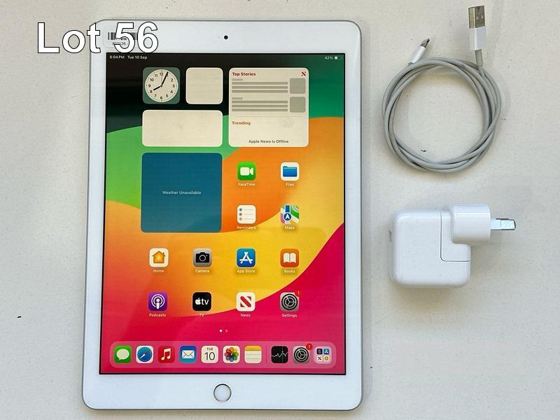 APPLE iPAD 6TH GEN, 128GB, Wi-Fi, SILVER, MODEL MR7K2X/A, A1893 WITH CABLE & CHARGER S/N:DMPXJLMYJF8N