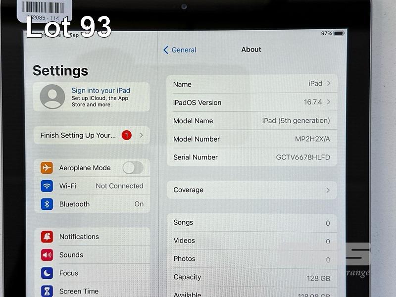 APPLE iPAD 5TH GEN, 128GB, Wi-Fi, SPACE GREY, MODEL MP2H2X/A, A1822 (NO CABLE, NO CHARGER) S/N:GCTV6678HLFD