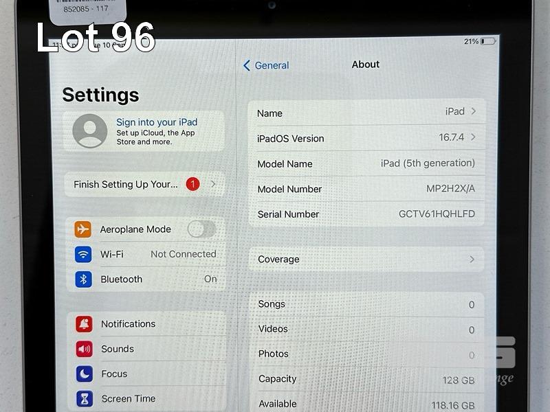 APPLE iPAD 5TH GEN, 128GB, Wi-Fi, SPACE GREY, MODEL MP2H2X/A, A1822 (NO CABLE, NO CHARGER) S/N:GCTV61HQHLFD