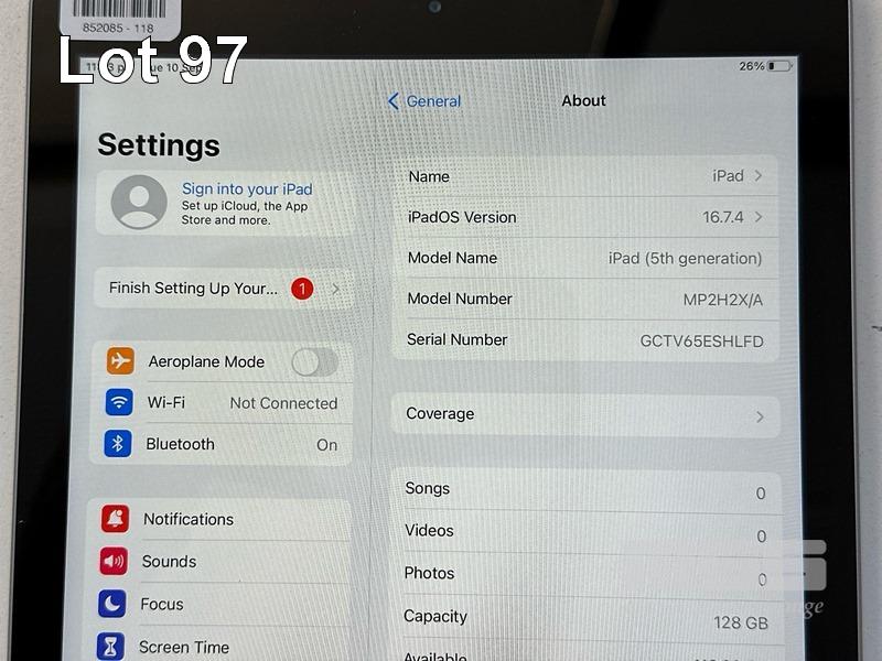 APPLE iPAD 5TH GEN, 128GB, Wi-Fi, SPACE GREY, MODEL MP2H2X/A, A1822 (NO CABLE, NO CHARGER) S/N:GCTV65ESHLFD